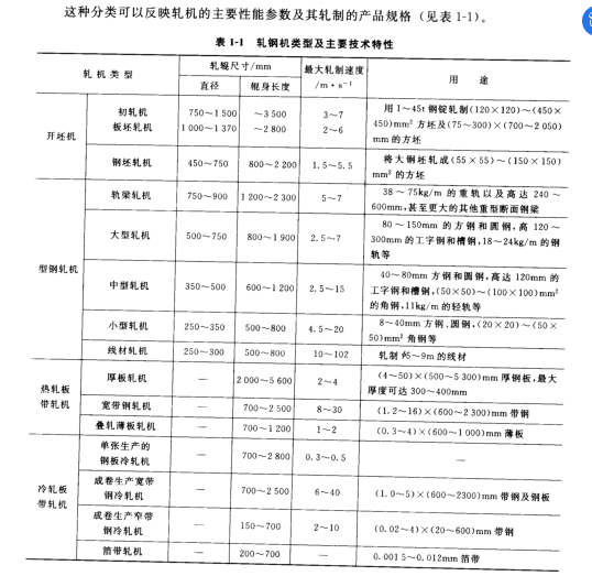 這種分類可以反映軋機的主要性能參數(shù)及其軋制的產(chǎn)品規(guī)格(見表1-2)