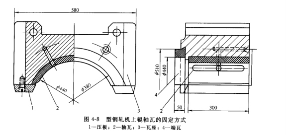 三輥型鋼軋機的中輥是固定得,中輥調整只是按軸承的磨損程度調軸承的上瓦座,保證輥頸與軸承,軸承襯之間的合適間隙。由于這一調整量較小,常用斜楔機構。典型結構用斜楔壓緊“H”形瓦座的方式,這種結構換輥方便,使用較廣。