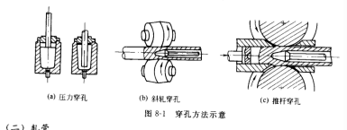 即將實(shí)心管壞穿孔成空心毛管。常見(jiàn)的管壞穿孔方法有斜軋穿孔(二輾、狄舍爾和三輾)、壓力穿孔和推桿穿孔 (PPM) 等三種,如圖 8-1 所示。另外還有直接采用離心澆注,連鑄與電渣重熔等方法獲得空心管坯,而省去穿孔工序。