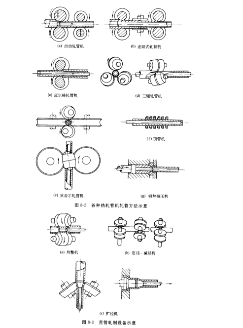 軋,管是將空心毛管軋成接近成品尺寸的荒管。常見(jiàn)的軋管方法有自動(dòng)軋管機(jī)、連續(xù)式軋管機(jī)(全浮動(dòng)式 MM、限動(dòng)心棒 MPM)、皮爾格軋管機(jī)(周期式軋管機(jī))、三輾軋管機(jī)、狄舍爾軋管機(jī)、頂管機(jī)和鋼熱擠壓機(jī),如圖 8-2所示。