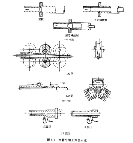 鋼管冷加工方法有冷軋、冷拔和旋壓等三種(見(jiàn)圖 8-4)。旋壓本質(zhì)上也是一種冷軋,冷軋管機(jī)和旋壓機(jī)的規(guī)格大小用其軋制的產(chǎn)品規(guī)格 (較大外徑) 和軋管機(jī)型式來(lái)表示。 例如,LG-150表示軋管機(jī)的型式為二輥周期式冷軋管機(jī),軋制鋼管的較大外徑為卵150mm。LD-30表示為多輥式冷軋管機(jī),軋制鋼管較大外徑為 中30mm。冷拔機(jī)的規(guī)格用其允許的額定拔制力大小和冷拔機(jī)的傳動(dòng)方式來(lái)表示,例如,LB-20表示為額定拔制力20t 的鏈?zhǔn)嚼浒螜C(jī);80t 液壓冷拔機(jī)表示額定拔制力為80t,采用液壓傳動(dòng)。