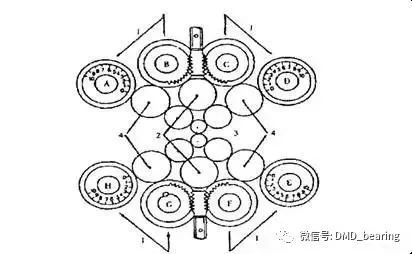(1)支承輥(2)一中間輥、二中間從動輥(3)工作輥(4)二中間傳動輥