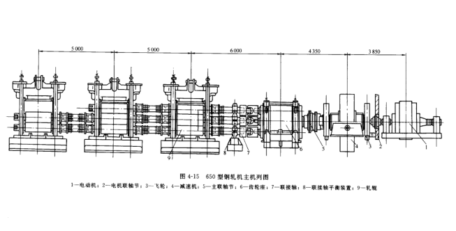 圖4-15所示為650型鋼軋機(jī)主機(jī)列圖,電動(dòng)機(jī)1的運(yùn)動(dòng)和力矩通過(guò)電動(dòng)機(jī)連軸節(jié)2,減速機(jī)4,朱連軸節(jié)5,齒輪座6和連接軸7傳遞給軋輥9,在此傳動(dòng)中設(shè)置了飛輪3及聯(lián)軸節(jié)平衡裝置8.