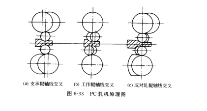 PC軋機(jī)基本上是一種四輥軋機(jī),與一般四輥軋機(jī)主要不同之處是將平行布置的軋輥改變交叉布置。在軋制過程中,當(dāng)離開中心的距離增大時,gun風(fēng)也增大,一次來控制凸度,這與使工作輥凸度變化等效。就是說,PC軋機(jī)是利用調(diào)節(jié)軋輥軸線的交叉角度來控制凸度,是輥縫可調(diào),而工作輥又不至于產(chǎn)生撓度。因此,凸度控制不會永祥工作輥的強(qiáng)度和剛度。軋輥軸線交叉布置可以有三種形式(見圖6-33):支撐輥軸線交叉布置:工作輥軸線交叉布置和承兌軋輥軸線交叉布置等。只要改變交叉角,就能改變軋輥凸度。工作輥軸線交叉布置時,軋輥凸度變化范圍較大,但是這種布置形式的軋機(jī)未能的到實際應(yīng)用。因為這種形式布置的軋機(jī),在公祖哦gun和支撐輥之間產(chǎn)生較大的相對滑動,使軋輥磨損和能量消耗大為增加。當(dāng)支撐輥軸線交叉布置時,其效果同工作輥軸線交叉布置時一樣,在工作輥和支撐輥之間同樣產(chǎn)生相對滑動,使軋輥磨損和能量消耗大為增加。當(dāng)軋輥軸線承兌交叉布置時,工作輥和支撐輥之間就不會產(chǎn)生相對滑動,這就消除了上述弊端,因此得到實際應(yīng)用的PC軋機(jī)即時采用“承兌交叉”布置的軋機(jī)。