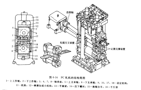 圖6-34所示為軋輥成對交叉布置的 PC軋機(jī)結(jié)構(gòu)簡圖,上、下工作輾(1、2)的軸承座(3、4)分別裝在上 、下支承輥(5、6)的軸承座(7、8)中,上工作輾輸編與上支承輥軸線大致保持平行。上、下支承輥軸承座的位置設(shè)定機(jī)構(gòu)(9、10)固定在機(jī)架(11)的兩側(cè)。上、下支承輥軸承座還能借助于驅(qū)動機(jī)構(gòu)沿軋制方向移動,或保持在所定的位置上。上支承輥軸承座通過摩擦力減小機(jī)構(gòu) (12) 由平衡梁(13)來支承,而平衡梁通過壓下螺絲(14) 把軋制力傳給機(jī)架。 下面一對軋輥承受的軋制力通過摩擦力減小機(jī)構(gòu)傳給換輥臺車(15),較后通過液壓千斤頂(16)傳給機(jī)架。上、下工作輾軸承座的位置設(shè)定機(jī)構(gòu)(17、18)也可借助于驅(qū)動機(jī)構(gòu)使上、下工作輥軸承座沿軋制方向移動,或固定在所定位置上。